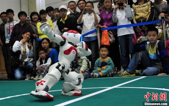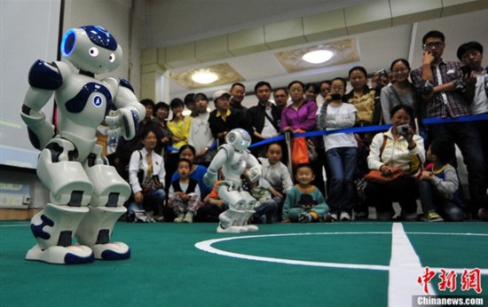5月18日,中国科技大学科技活动周活动在中科大东、西两个校区同时举行。活动期间,中科大国家同步辐射实验室、火灾科学国家重点实验室、核探测与核电子国家重点实验室等多个实验室和科普点对市民开放,并采取图片展、模型展、大型实验演示、科普讲座、智能机器人演示等活动,吸引了众多市民尤其是青少年前来参观体验。图为仿人智能机器人NAO在表演街舞。中新社发 韩苏原 摄