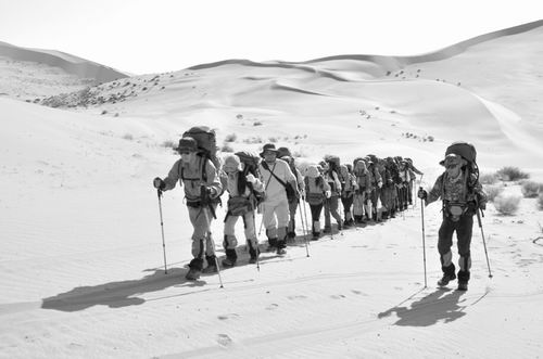 中国科大科考协会行走在巴丹吉林沙漠上。