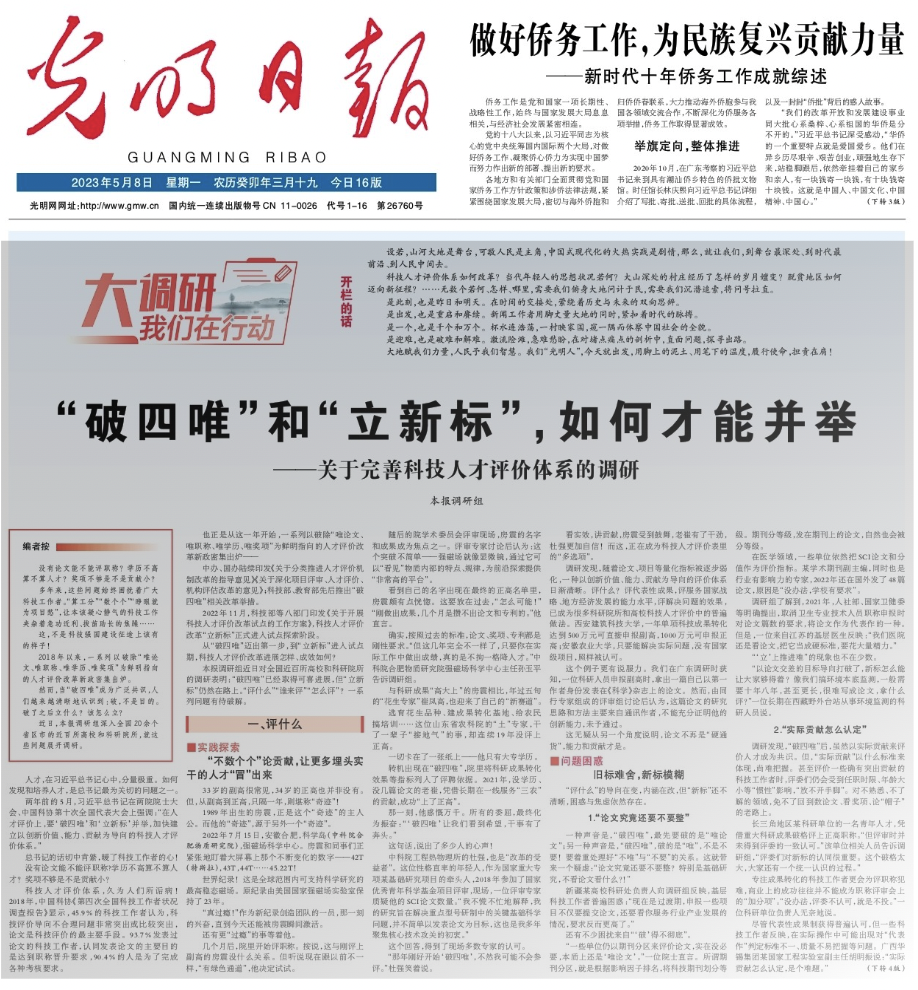 两年前的5月,习近平总书记在两院院士大会、中国科协第十次全国代表大会上强调:“在人才评价上,要‘破四唯’和‘立新标’并举,加快建立以创新价值、能力、贡献为导向的科技人才评价体系。”