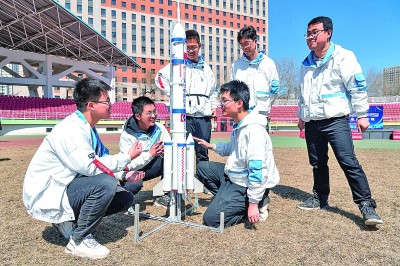 哈尔滨工业大学航模协会的学生在航模点火发射前进行讨论。新华社发