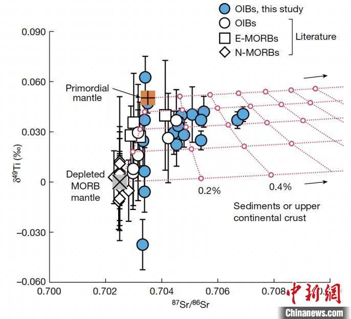 现代洋岛玄武岩和大洋中脊玄武岩的钛稳定同位素和锶同位素组成。中国科学技术大学 供图