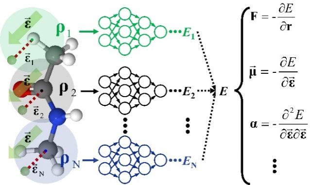 原子模拟是人们在微观层面理解复杂化学、生物和材料体系的光谱、反应动力学以及能量和电荷转移过程的关键工具,其关键要素是精确且高效的高维势能面(即力场)。近年来,基于精确的原子中心的机器学习相互作用势进行高效、准确的分子模拟已经成为一种常用的做法。然而,这些模型通常是用于描述孤立体系,将能量仅视为原子坐标和原子种类的函数,无法表达外场与体系之间的相互作用。因此,亟须开发正确描述外场与体系相互作用的机器学习模型,以实现外场下复杂反应的精确且高效的模拟。