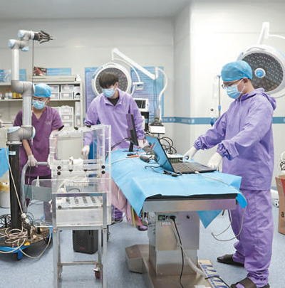 研究团队正在开展介入式脑机接口控制机械臂试验。