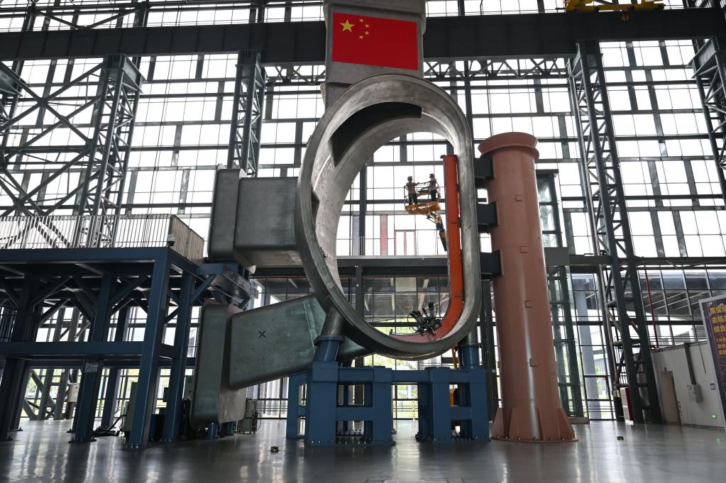 2023年9月15日,工作人员在聚变堆主机关键系统综合研究设施(CRAFT)1/8真空室及总体安装实验平台进行设备调试。(配本社同题文字稿)新华社记者 周牧 摄