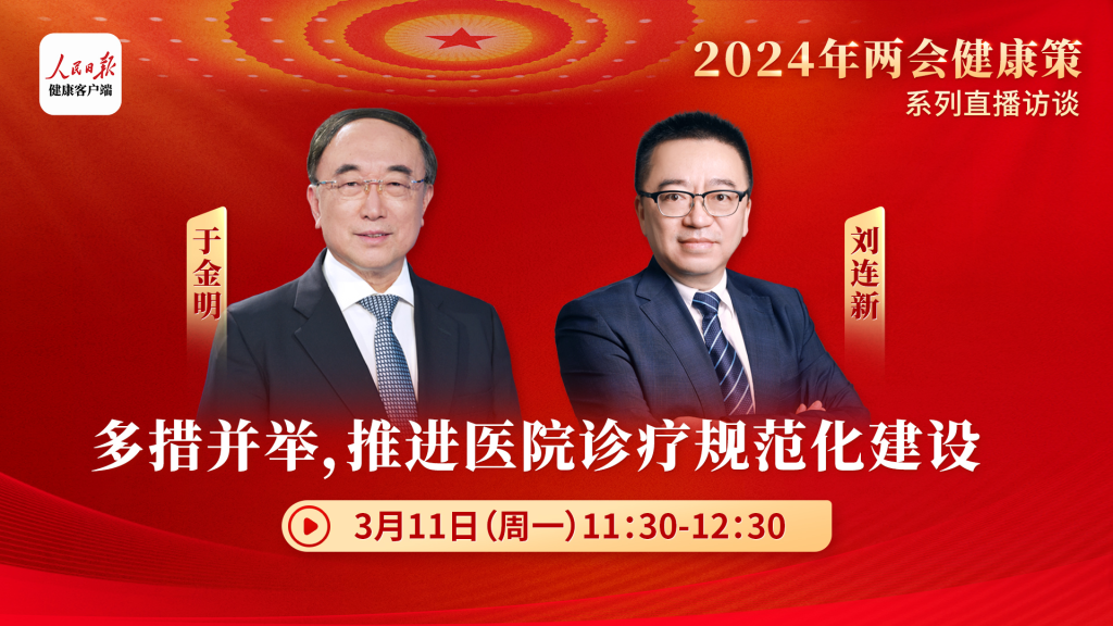 3月11日,于金明与中国科学技术大学附属第一医院党委书记刘连新,做客人民日报健康客户端2024两会健康策系列直播访谈节目,共同关注医院规范化诊疗建设问题。