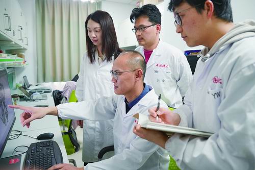 孙林峰(前排中)与团队成员分析ABCB19蛋白的电镜结构。周欣宇/摄