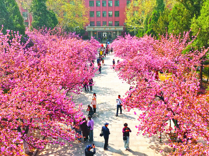 粉色樱花在阳光下挺起了身板,在春风中摇曳。昨日还是“羞答答”地待放,如今竟一夜盛放。不少师生聚在樱花大道上留影,穿着汉服、骑着单车、手持单反……共赴这场春日约会。