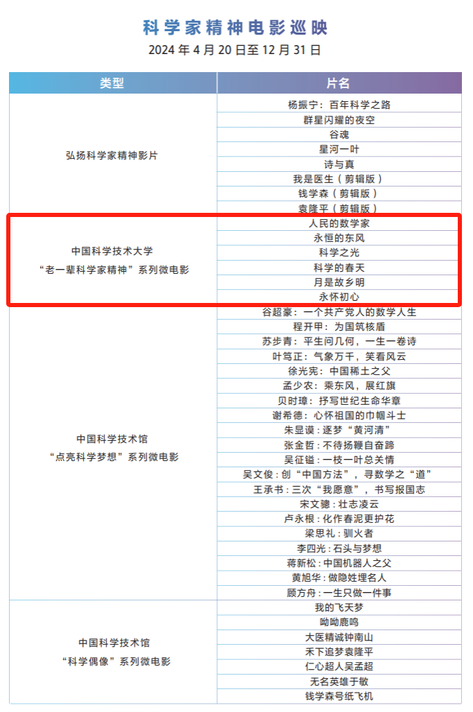 ??值得一提的是,在中国科学技术馆联合中国自然科学博物馆学会、全国科幻科普电影放映联盟共同开展的2024年“光影科学梦”科幻科普科学家精神全国科普场馆巡映活动中,“老一辈科学家精神”系列微电影《永怀初心》《月是故乡明》《科学之光》《永恒的东风》《科学的春天》《人民的数学家》入选巡映影片,将于4月20日-12月31日期间在全国67家科普场馆进行公益展映。