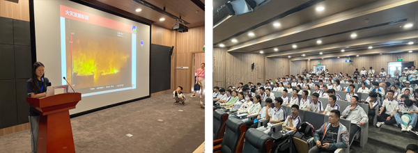 在特种楼二楼报告厅内,榕嘉高级工程师为前来参观的同学讲解了火灾和地震常见的避险误区、注意事项、科学地震逃生等趣味性的科普知识。实验室科普中心的讲座负责人李昱、于松洋为同学们讲解了火灾的发展阶段、逃生通道标识、灭火基本常识等火灾知识。