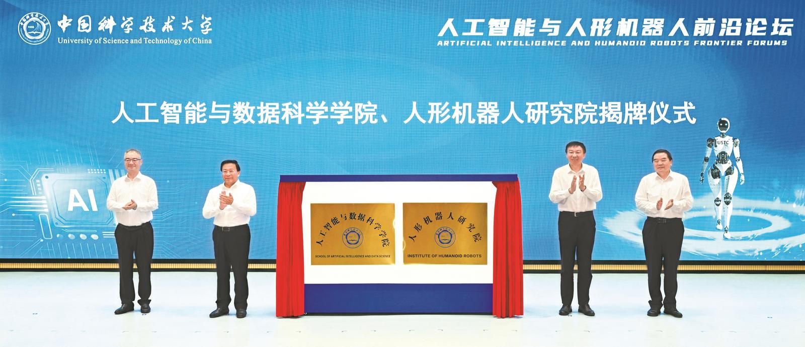 6月18日上午,中国科学技术大学人工智能与人形机器人前沿论坛在学校高新园区举行。省委书记韩俊、省长王清宪和中国科大党委书记舒歌群、校长包信和共同为中国科大人工智能与数据科学学院、人形机器人研究院揭牌。本报记者 杨 竹 摄