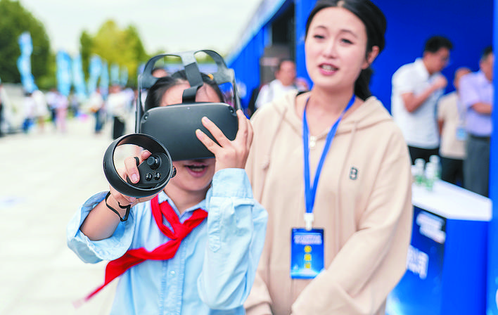 合肥市颐和佳苑小学教育集团金牛路校区学生王若惜体验VR眼镜。