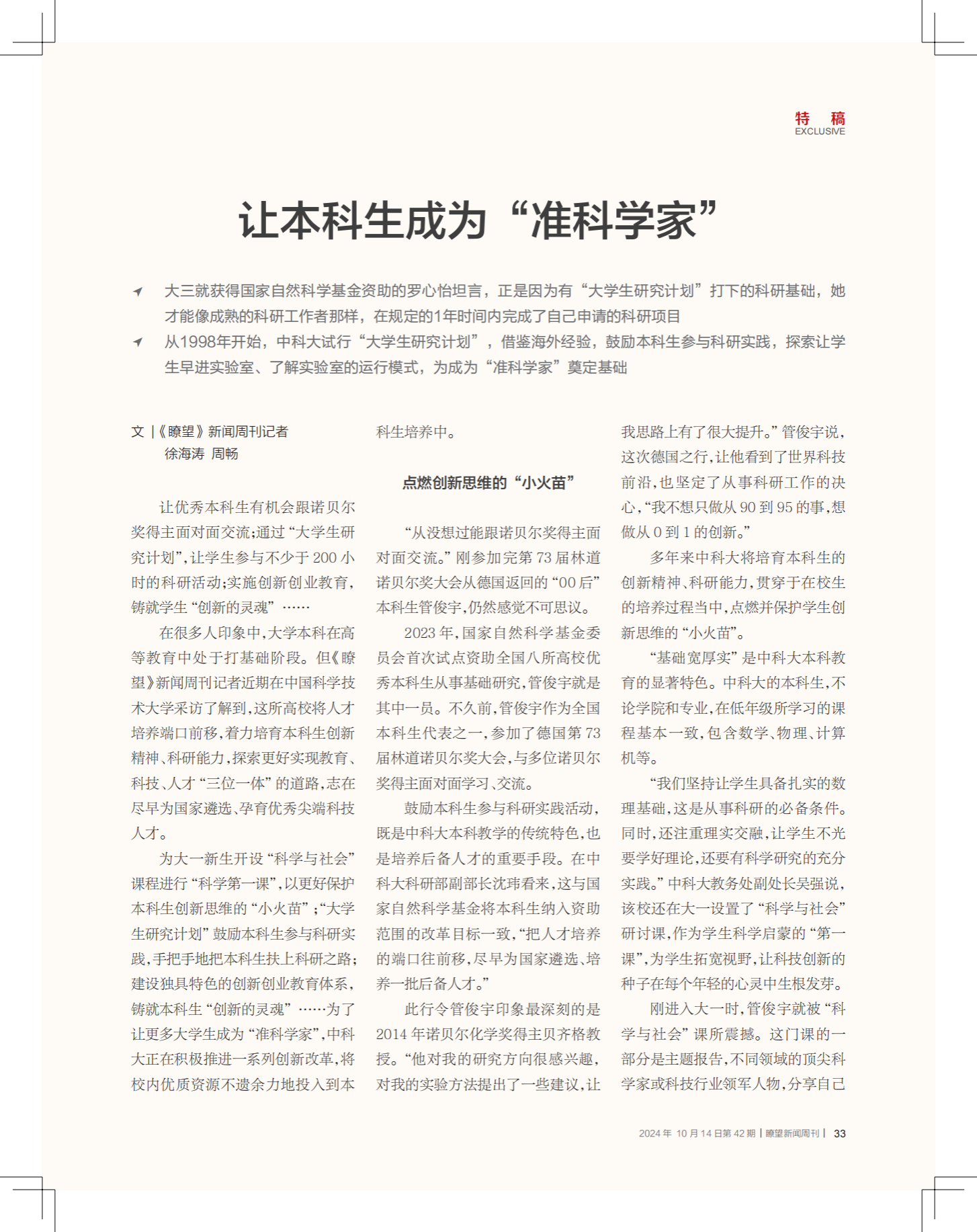 在很多人印象中,大学本科在高等教育中处于打基础阶段。但《瞭望》新闻周刊记者近期在中国科学技术大学采访了解到,这所高校将人才培养端口前移,着力培育本科生创新精神、科研能力,探索更好实现教育、科技、人才“三位一体”的道路,志在尽早为国家遴选、孕育优秀尖端科技人才。