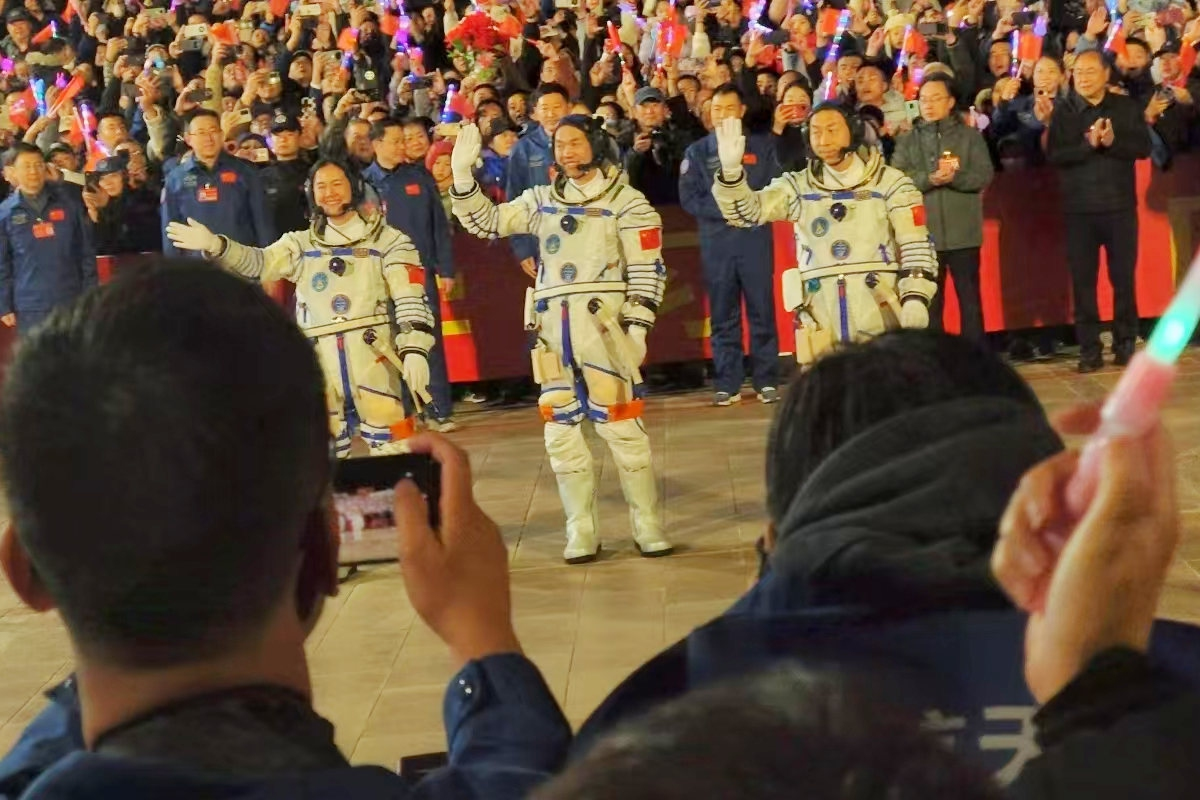 10月30日凌晨,东风航天城问天阁。师生一行来到“宇航东路”和“航天路”交会处的圆梦广场,参加航天员乘组的出征仪式。“祝你们成功,等你们凯旋!”袁辰熠和同学们齐声呼喊,带动着欢送区的人们一遍遍喊出祝福。