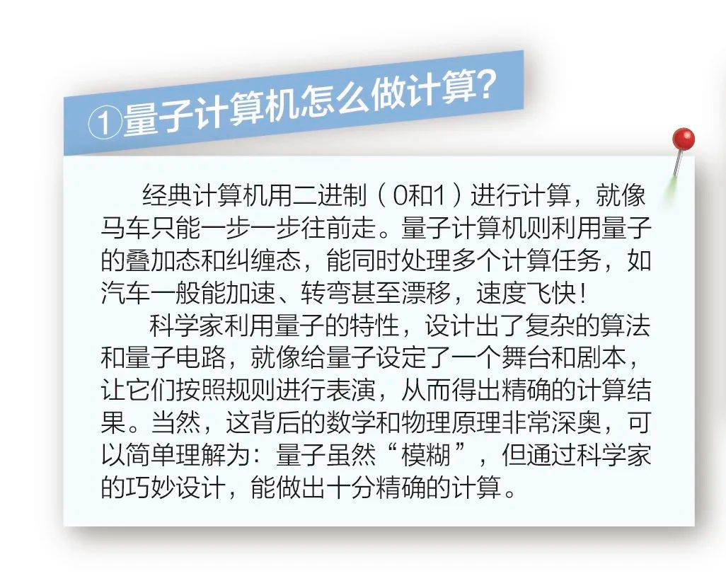如果把量子科技比作一架“飞机”,那么量子计算就相当于飞机的“发动机”,量子通信就相当于飞机的“无线电”,量子测量就相当于飞机的“雷达”。量子计算是利用量子技术获取更强算力,量子通信是利用量子技术获得更安全通信,量子测量是利用量子技术获得更精准的测量。