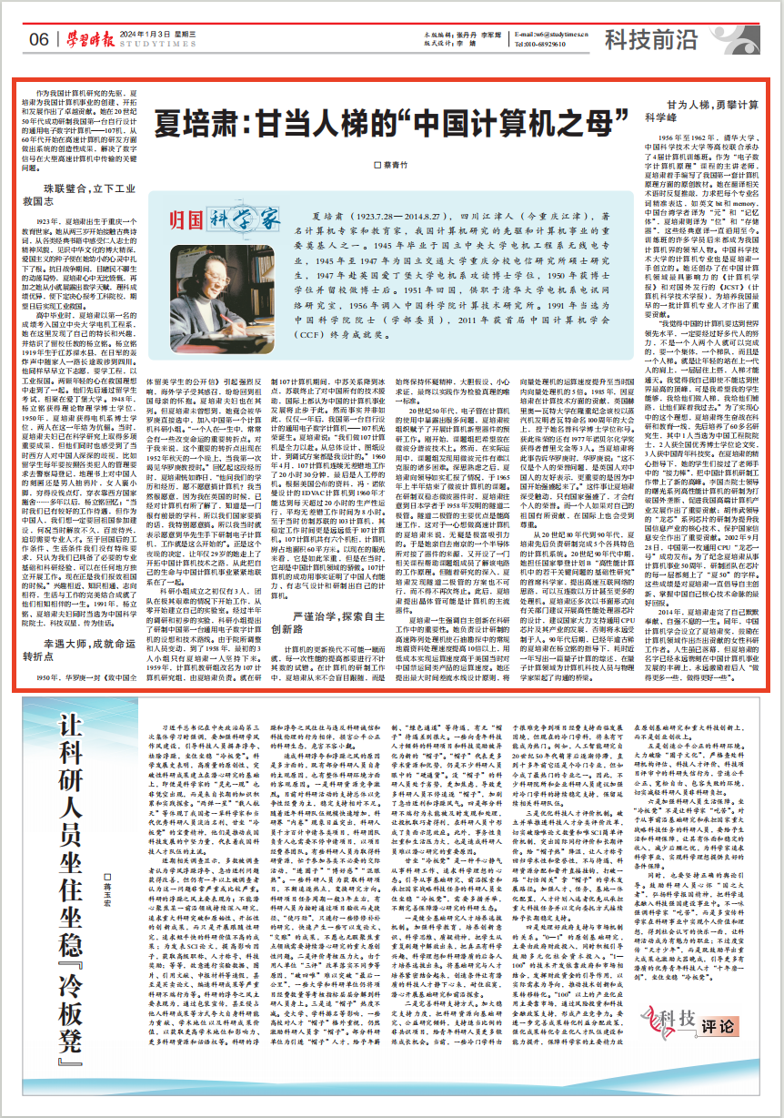 1956年至1962年,清华大学、中国科学技术大学等高校联合承办了4届计算机训练班。作为“电子数字计算机原理”课程的主讲老师,夏培肃着手编写了我国第一套计算机原理方面的原创教材。她在翻译相关术语时反复推敲,力求把每个专业名词精准表达,如英文bit和memory,中国台湾学者译为“元”和“记忆体”,夏培肃则译为“位”和“存储器”,这些经典意译一直沿用至今。训练班的许多学员后来都成为我国计算机界的领军人物。中国科学技术大学的计算机专业也是夏培肃一手创立的。她还创办了在中国计算机领域最具影响力的《计算机学报》和对国外发行的《JCST》(计算机科学技术学报),为培养我国最早的一批计算机专业人才作出了重要贡献。