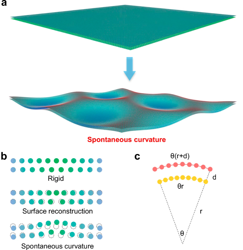 为此,钟志诚团队提出了“自发弯曲”模型,用以解释二维异质结构中原子重排导致的面外起伏。这种弯曲是由堆叠能量和变形能量之间的竞争驱动,与平面内应变无关。