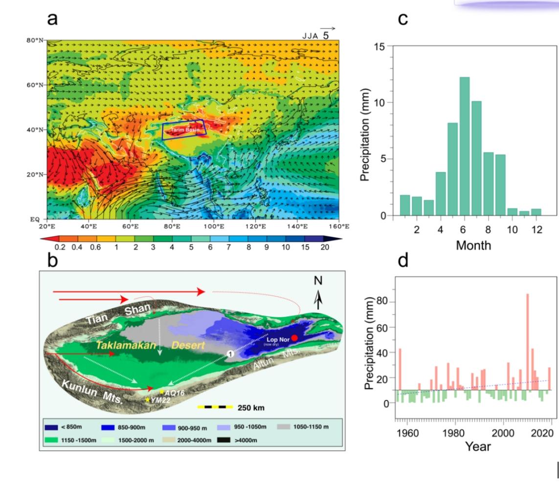 塔里木盆地位于欧亚大陆的腹地,是世界第二大流动沙漠——塔克拉玛干沙漠的所在地。该地区年降水量不足50毫米,气候极为干旱,其水文气候变化的历史一直备受关注。