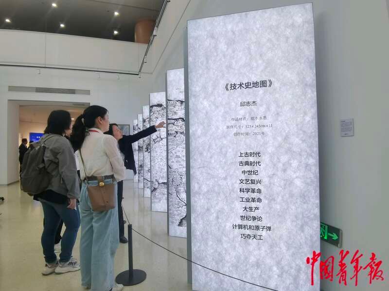 策展团队突破传统科普范式,将抽象理论转化为可感知的艺术形态。在“量子音乐实验室”,实验室的真实声音经过艺术解构重组,形成一首首量子舞曲;“寰宇全图”技术史地图以山水笔墨的表现手法,展现艺术家看待世界和科技发展的独特视角;量子期刊封面墙则为体会量子科技时代变迁提供全新视角。