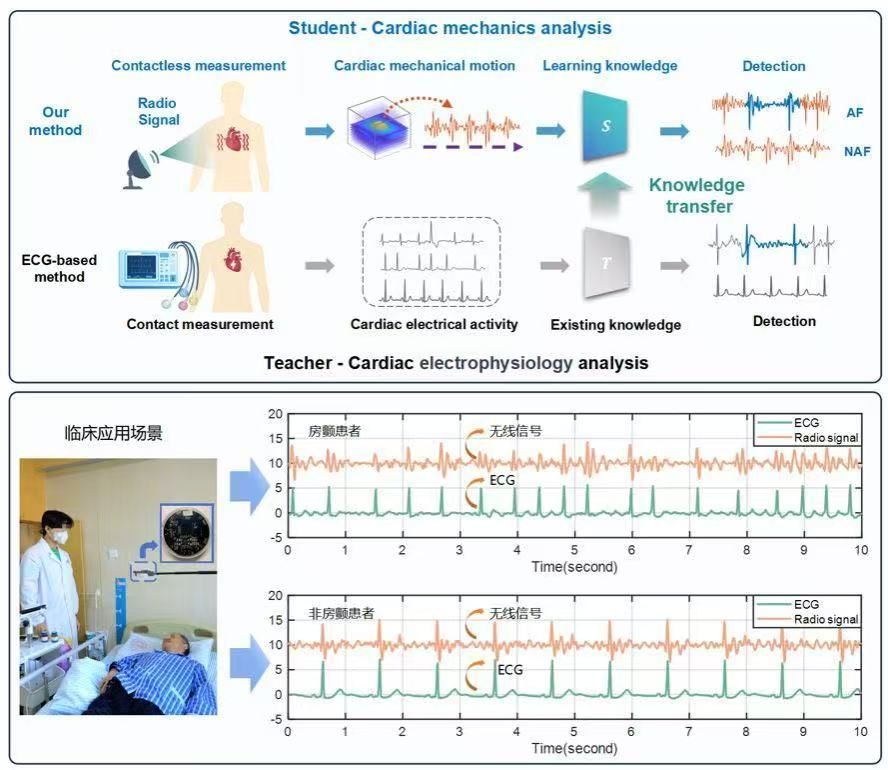 陈彦教授团队提出的新方法利用毫米波雷达感知技术,通过检测心脏机械运动来诊断房颤。房颤发生时,心脏电脉冲的有序传导遭到破坏,紊乱的电信号引发异常的机械运动,进而驱动胸壁位移形成体表机械波动,这一现象可被毫米波雷达检测。团队开发了专用的雷达信号处理算法,可高精度捕获毫米级心脏机械运动,并通过知识迁移技术与心脏电-机械耦合机制,利用现有心电数据库中的诊断知识,训练AI模型精准识别房颤特有的机械运动模式。