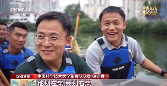 坐在龙舟前排的两位划手是双胞胎,哥哥徐亦尧,弟弟徐亦舜。他们都毕业于中国科大计算机专业,目前已是中国科大教职工。“双胞胎嘛,他划左桨,我划右桨,正好坐一排了,我们也比较有默契。”中国科学技术大学龙舟队队员徐亦舜这样说。无论是学习还是运动,兄弟俩都保持了高度的默契。2017年暑假,当时读本科的他们在健身房锻炼,偶然了解到中国科大龙舟队,谈到这时,徐亦舜说:“大家都在健身,然后看到有一群力量非常强的人,因为我本身就比较喜欢健身,就上去一问,就说他们是龙舟队的一个集训,就加入到这个龙舟队。”