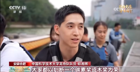 临近比赛,加紧训练被提上日程。不过,队员们有的忙着科研任务,有的忙着上课、做实验,好不容易凑齐一船人,还碰到一些意外小插曲。一位划手的船桨划断了,“桨断了,拿个桨,”队员赵庭祺连忙递上一根新桨。队员欧湘辉告诉我们:“大家都以划断一个碳素桨或木桨为荣,因为证明他的训练量达标了。"