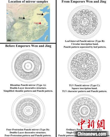 蟠螭镜的流行时间可跨越战国、秦代和西汉三个时期,是研究社会转型进程中铸镜业变化的关键器物。研究团队系统分析了中国安徽六安地区出土的40件蟠螭镜,分析内容涵盖表面纹饰、铭文内容和字体、化学组成、铅同位素比值和微量元素等。