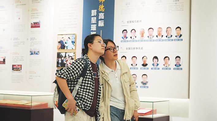 “为党育人 为国育才——教育家精神主题展”悄然开展,展柜摆放着泛黄的讲义、手写的教材和墨迹可见的旧信封。一位老师在展板前站了许久,轻声念着严济慈的语句:“要教好书,除要有真学问外,一要大胆,二要少而精,三要善于启发学生,识别人才。”